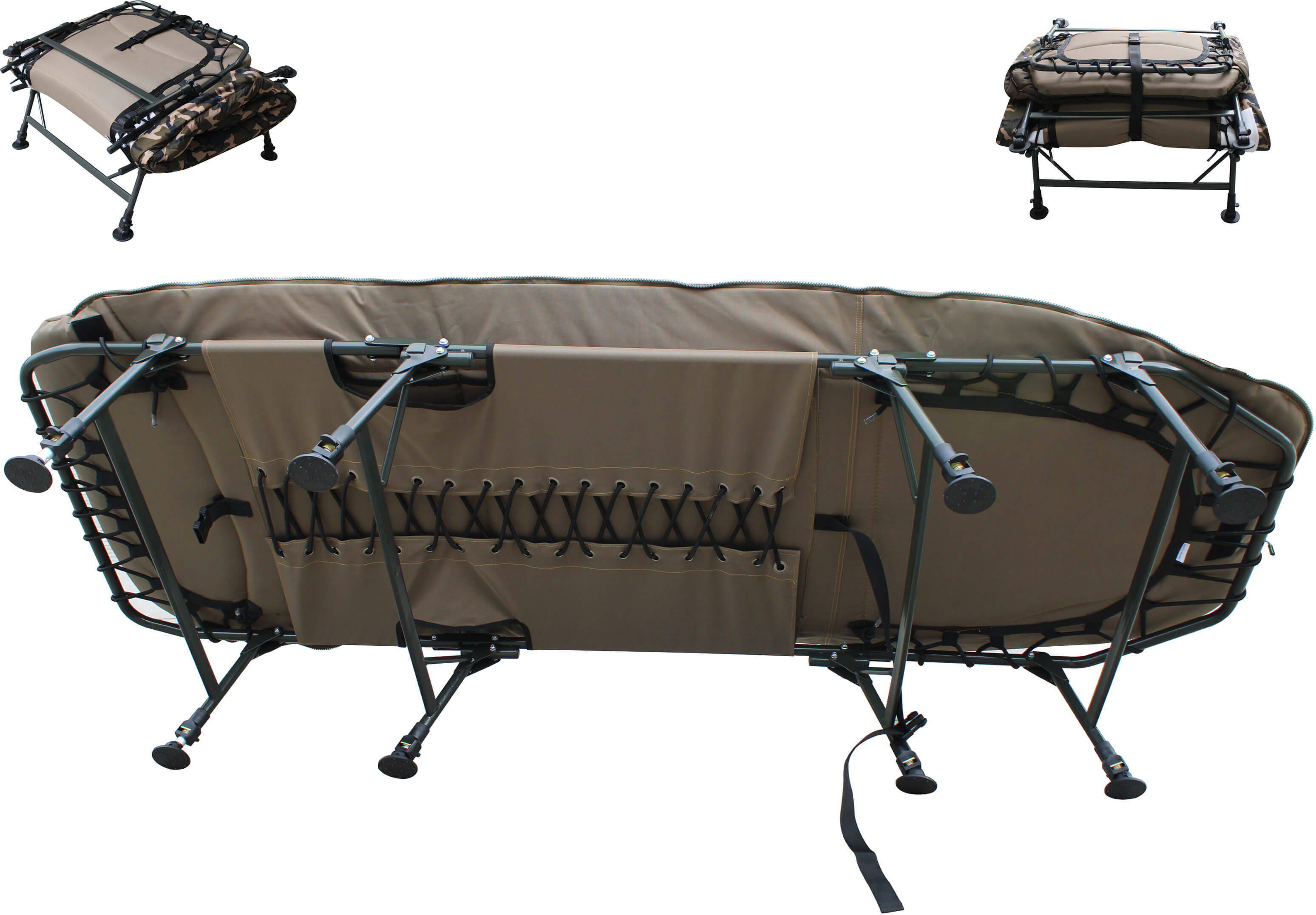 - Mittels Kompressionsband kann das Bedchair für den Transport sehr flach zusammengelegt werden