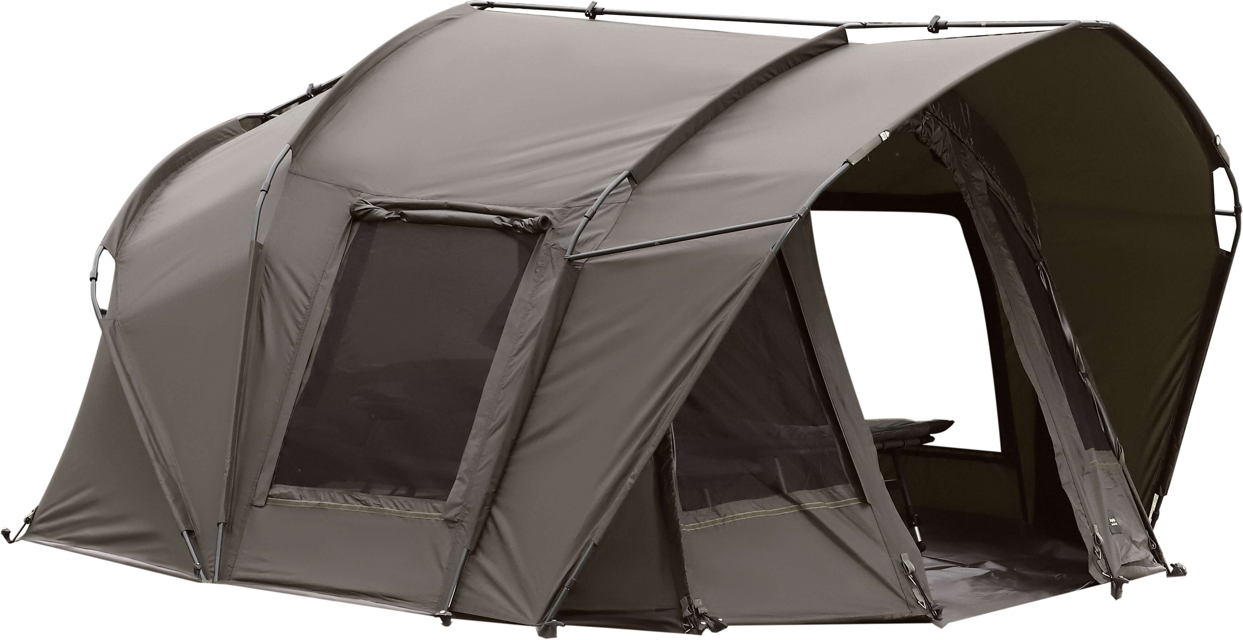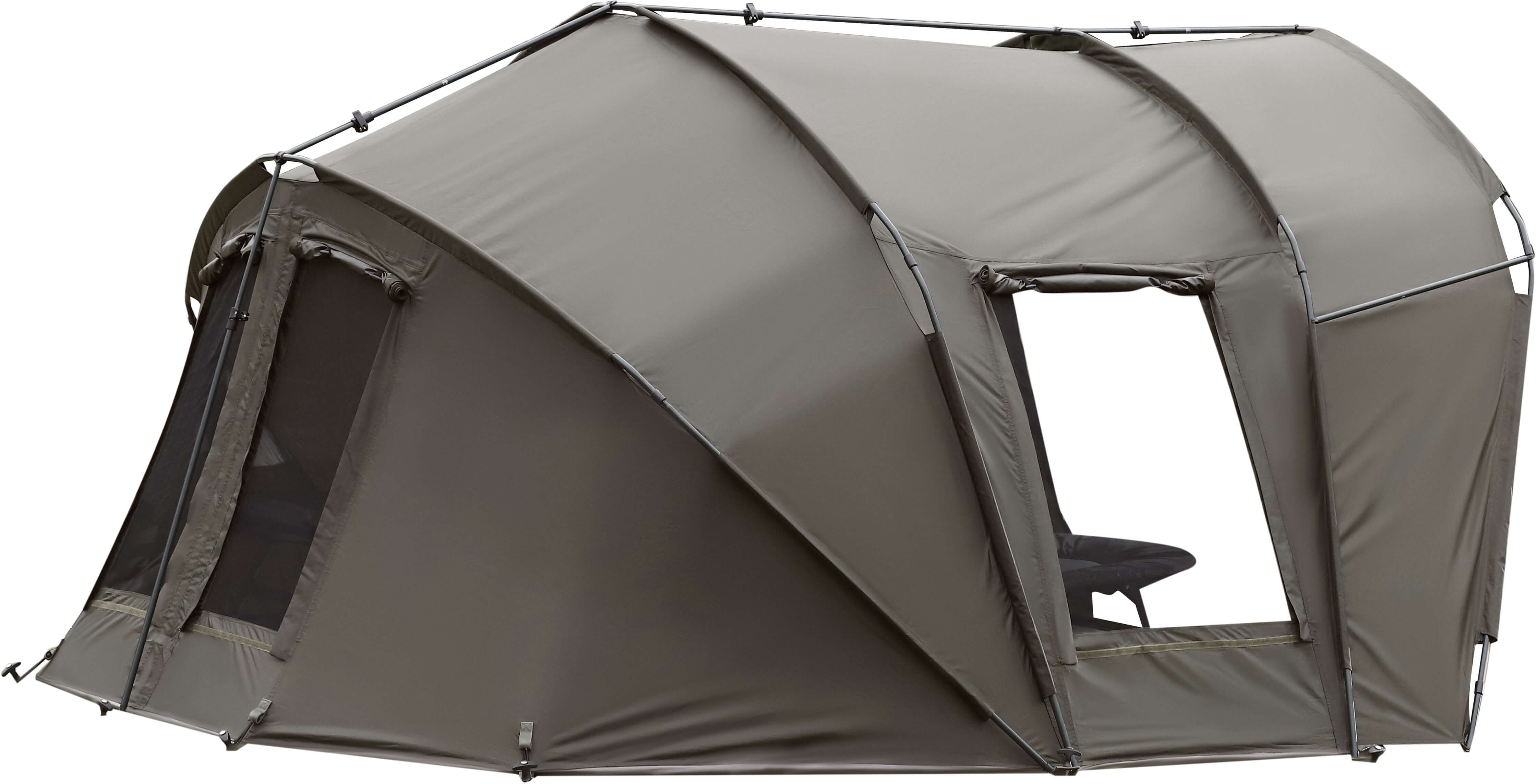Dieses Bivvy besitzt einen neuartigen 4 Frame System in 2.0, welcher deutlich steiler ist und somit deutlich mehr Innenvolumen gewährleistet, das Dome besser stützt und zugleich für eine hohe Formstabilität sorgt. Im vorderen Bereich ist ein zusätzlicher Bogen eingearbeitet und bietet ein Vordach gegen Wind und Wetter.
