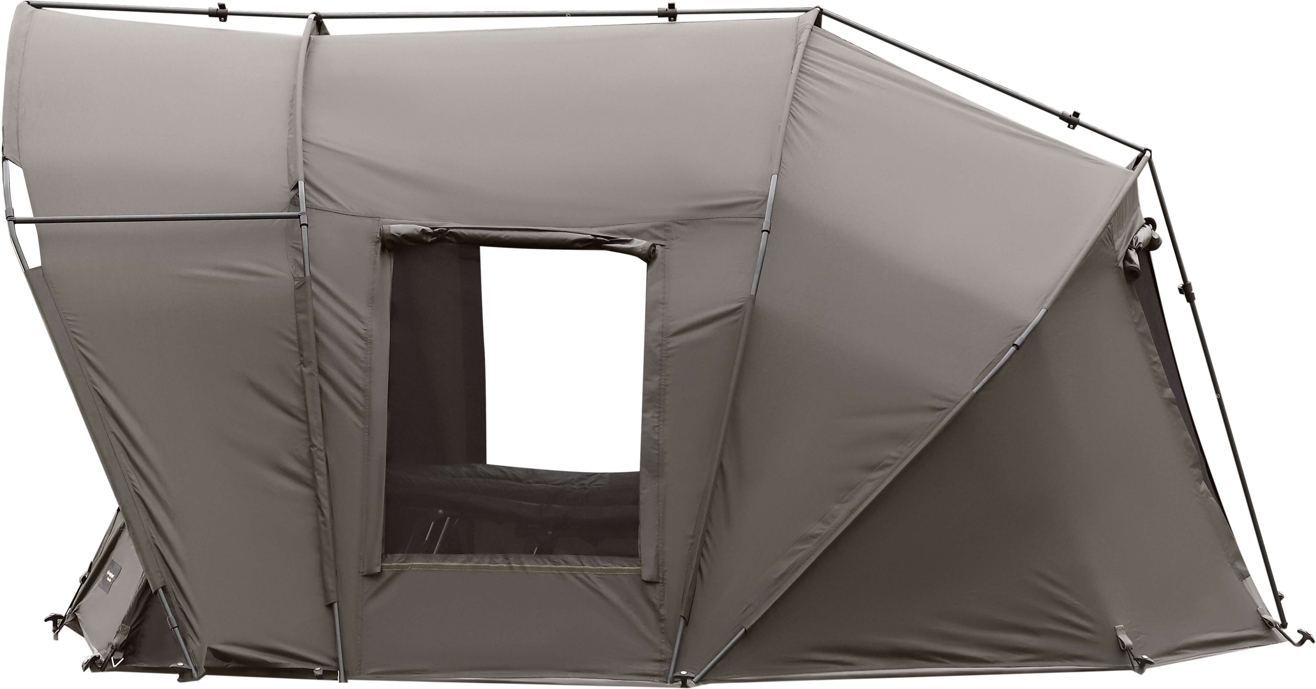 Die Frontseite des Bivvy ist mit einer Multifunktionstür ausgestattet. Hier kann zwischen einem Moskitonetz und einer Klarsichttür gewählt werden. Seitlich und hinten sind ebenfalls Moskitonetze eingearbeitet, welche mit Rollos und Klettverschlüssen abgedunkelt werden können.