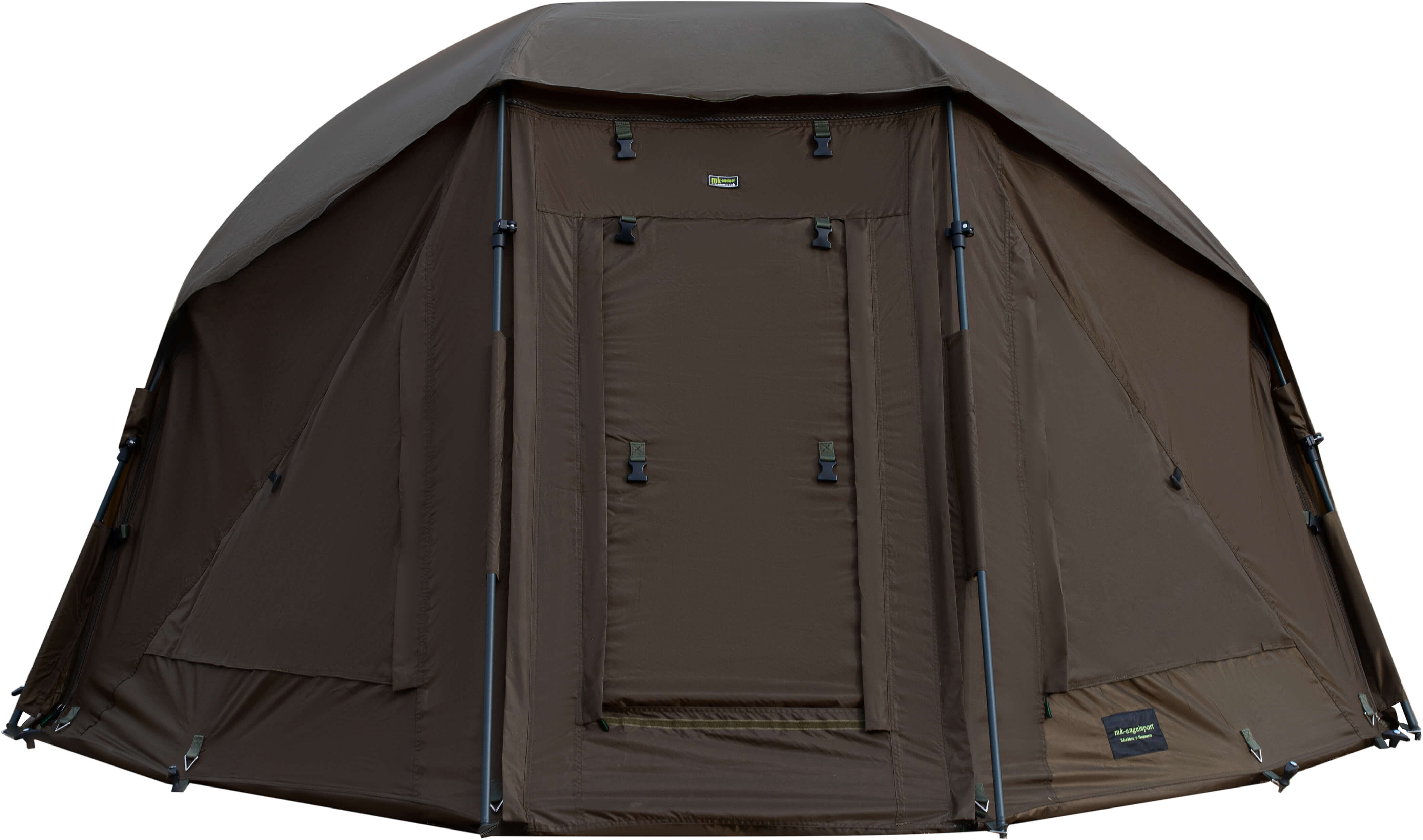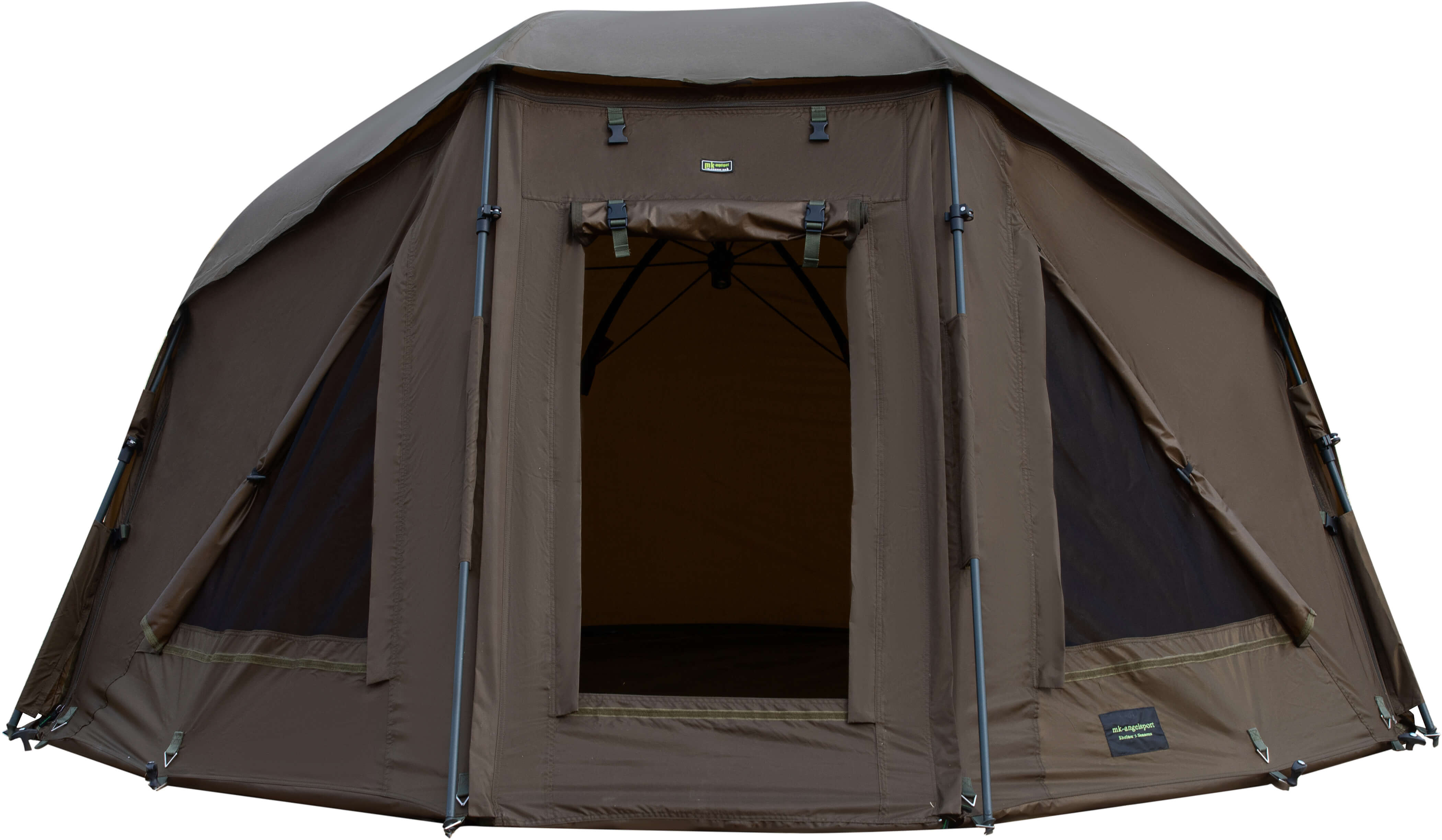 Die Moskitonetze der Türe und der seitlichen Fenster halten bei diesem Brolly Ungeziefer sicher ab. Die vordere Brolly-Türe kann auch mit der mitgelieferten Klarsichttüre aufgebaut werden. Die 4 Pole Stangen sind mit dem superbequemen GFK Schnellverschlüssen ausgestattet und schützen das Brolly gegen sicher Wetter und Sturm. Sie werden begeistert sein.