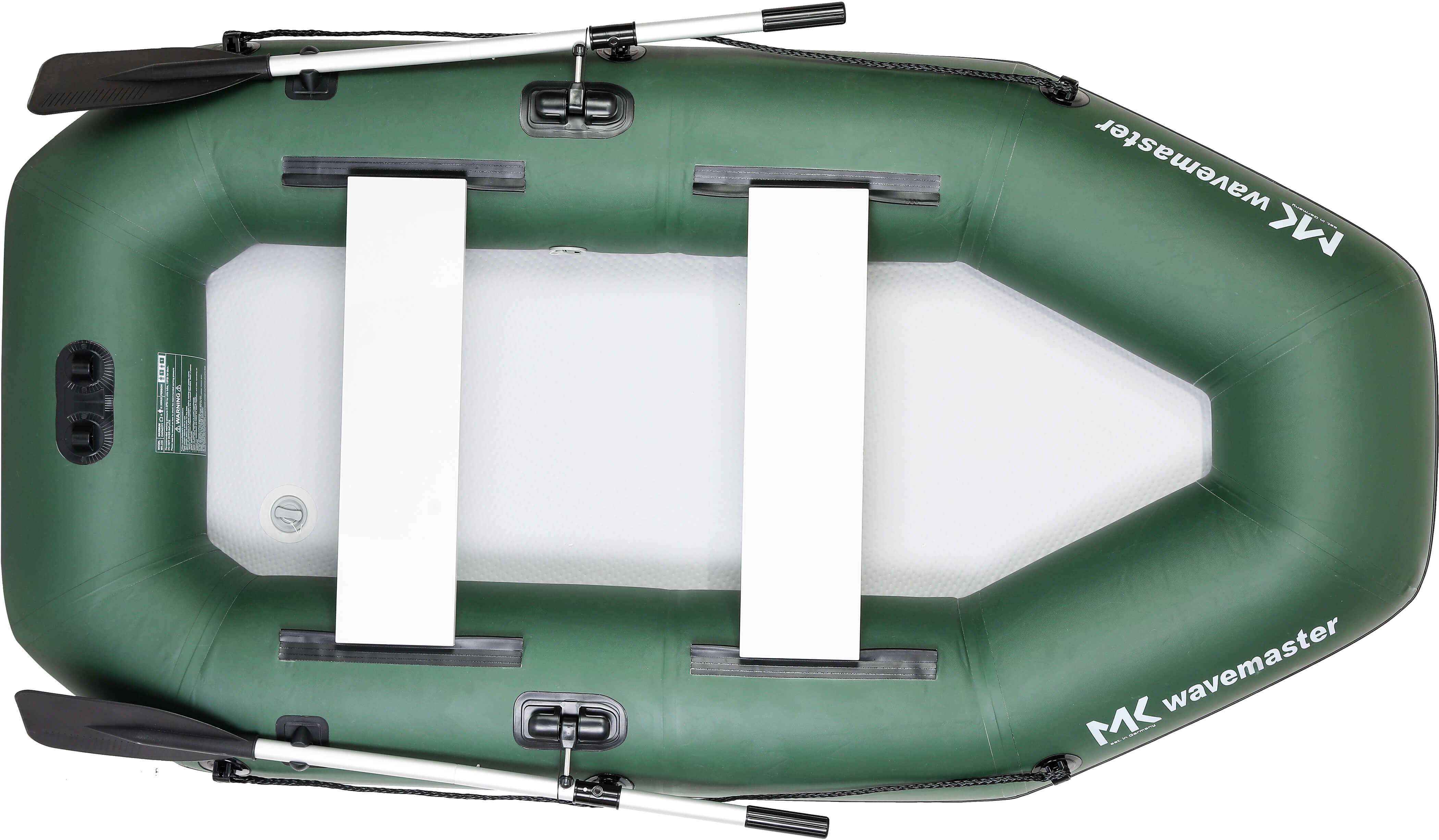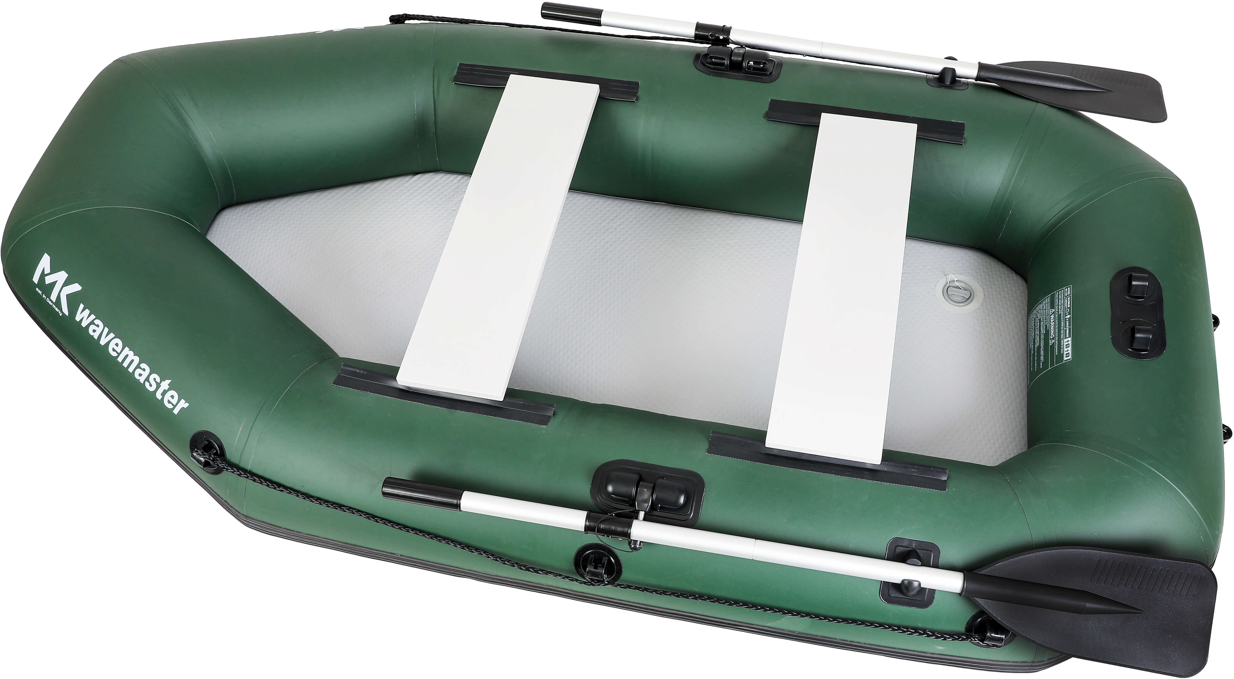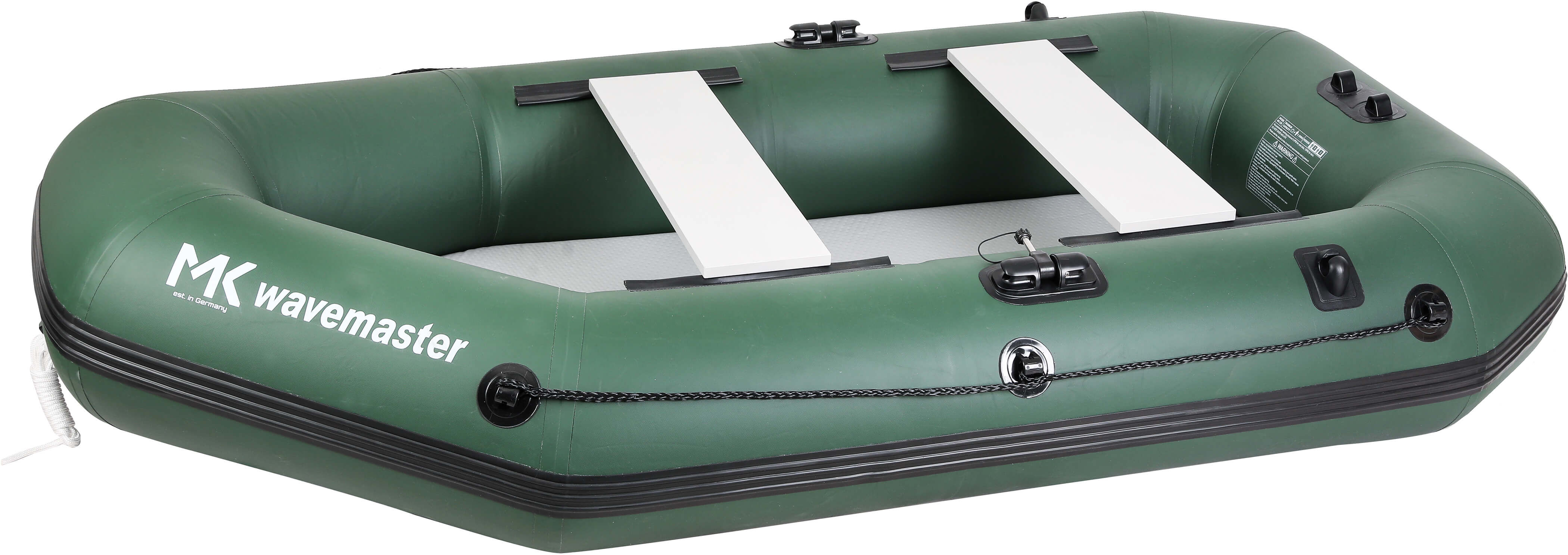 Das MK Wavemaster Schlauchboot wurde mit einem dreilagigem Bootshaut-Material gefertigt. Die beiden äußeren Lagen bestehen dabei aus strapazierfähigem Heavy Gauge Material, die Innenlage aus Polyester Mesh. So kann äußerste Stabilität und Festigkeit garantiert werden. Schließlich wird beim Angeln mit scharfem Gerät hantiert und es kann durchaus leicht ein Haken oder ähnliches hängen bleiben.