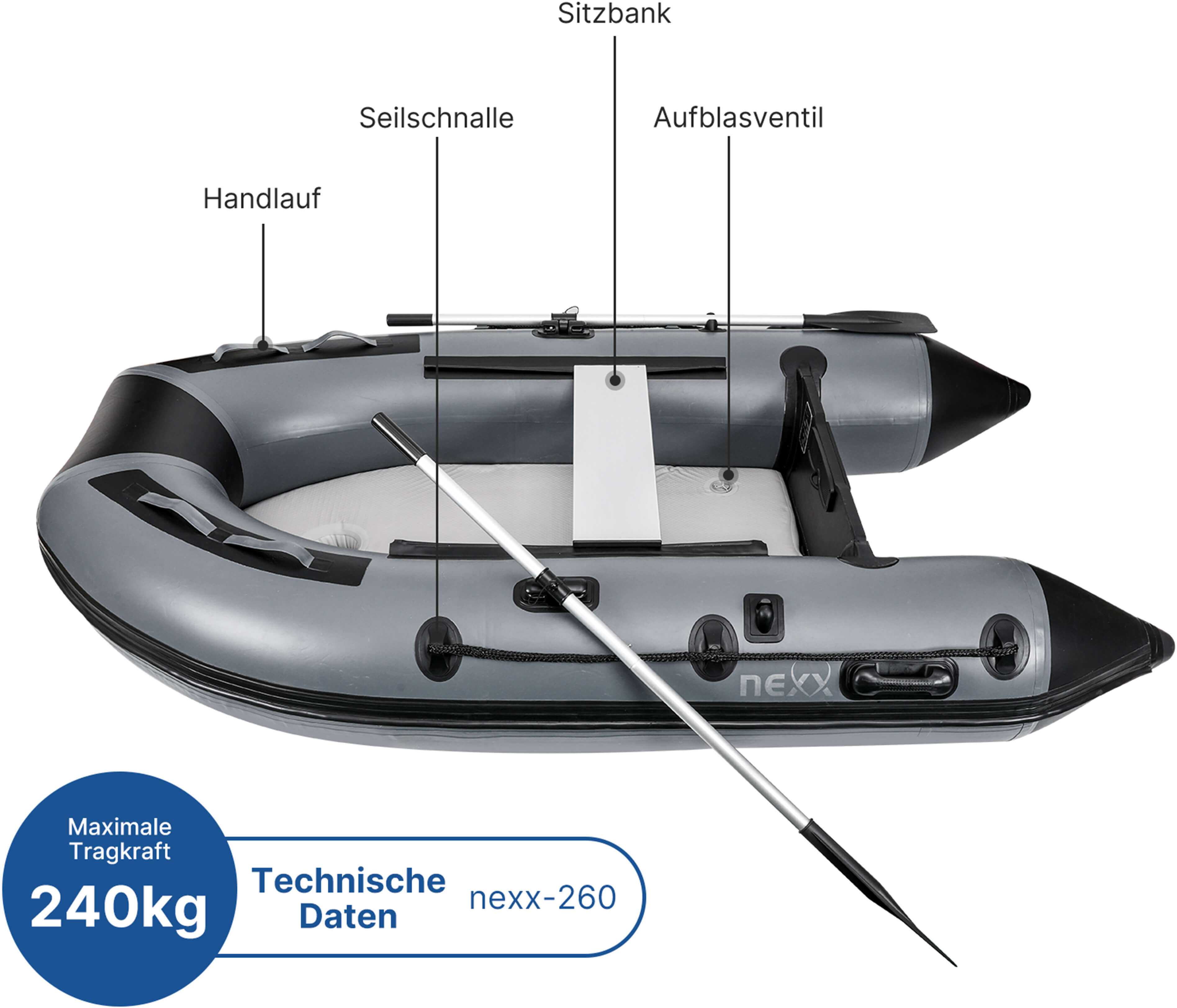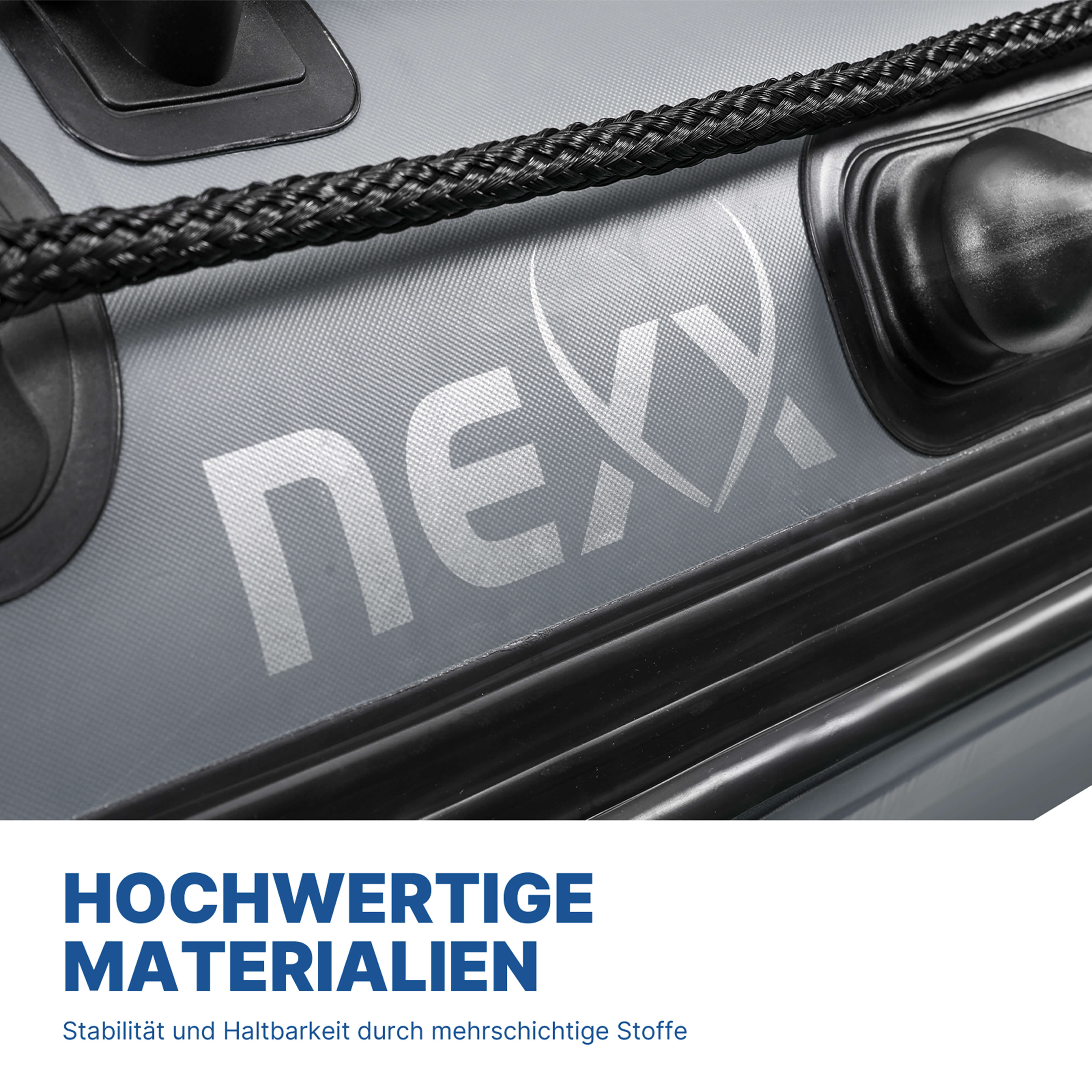 Durch Tragegriffe an Bug und Heck kann das Schlauchboot auch im aufgebauten Zustand ganz leicht transportiert werden. Mit einem Eigengewicht von ca. 30 kg ist das NEXX 260 Schlauchboot eines der leichtesten seiner Klasse und kann mit herausragender Stabilität punkten.